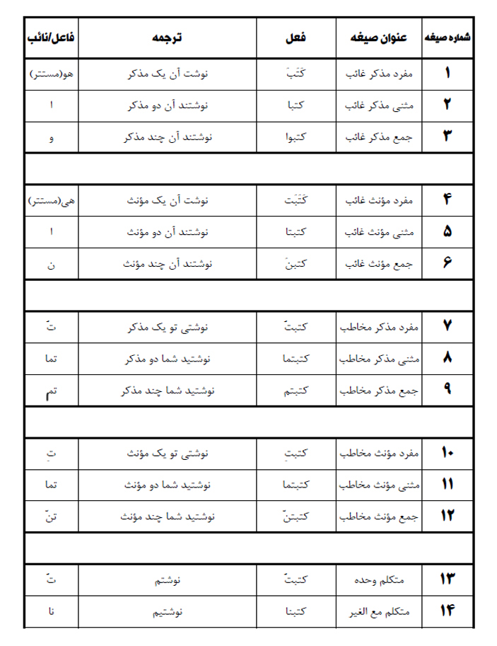 بعد از مدتی که تسلط شما به حدی رسید که توانستید به راحتی بعد از شنیدن شماره صیغه، عنوان آن را به یاد آورید، لازم نیست ستونِ مربوط به عنوان صیغه را یادداشت کنید و از فرم دوم استفاده کنید اما توصیه میشود حداقل ۳۰ فعل را با فرم اول صرف نمایید.